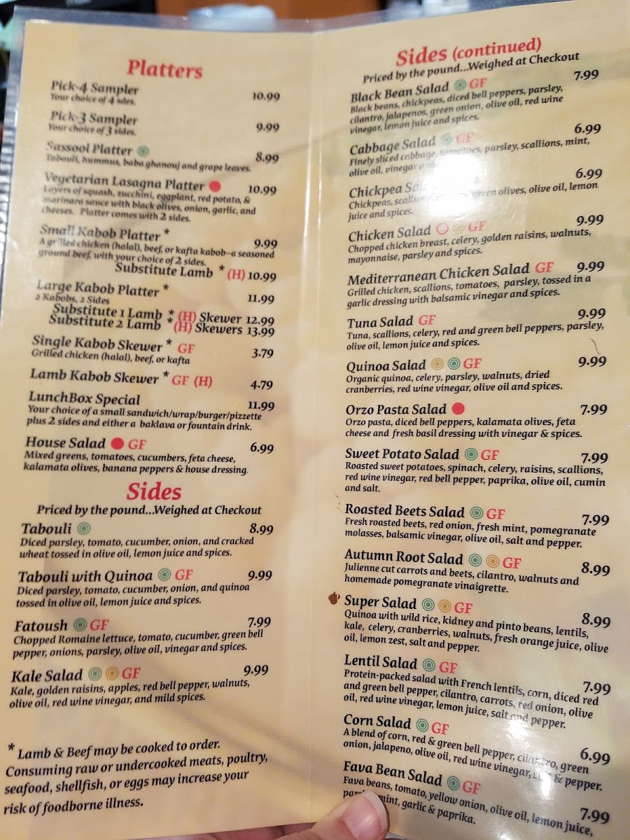 “ We had the special for Friday which is the salmon with rice and 2 sides for $16.99 so this price is not bad for the amount of food served. This place is delicious and every meal has so much good seasoning. I love the fact that all their food is fresh and everytime and even if they are busy with a long line out the door they have warm fresh pita bread to go along with your meal. I think the pita bread they give upon request is gluten free so this is a plus for me. Thanks Sassool for making your food fresh, healthy and with delicious seasoning. I never feel guilty of eating here this is just like eating homemade food and I don't mind the long line, hello they have a long line for a reason because they are that good. ”
